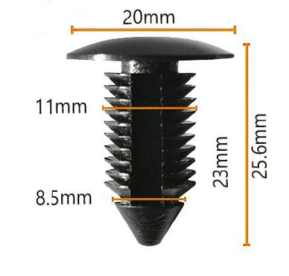 Fästelementets totala längd är 25,6 mm, bredden är 20 mm och huvudhöjden är 11 mm.