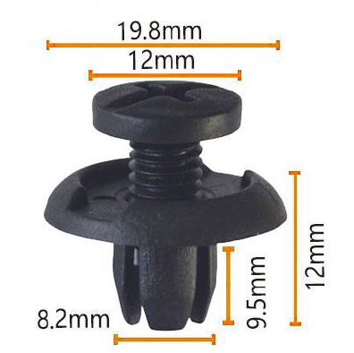 Mätning exakt 19,8 mm i längd, 12 mm i bredd, 9,5 mm i höjd och 8,2 mm i tjocklek överensstämmer detta fästelement till industristandarder, vilket säkerställer en sömlös passform med olika bildelar. Tillverkad av högkvalitativ svart plast, har den lätt konstruktion, korrosionsmotstånd och slitmotstånd, vilket förbättrar dess livslängd.
